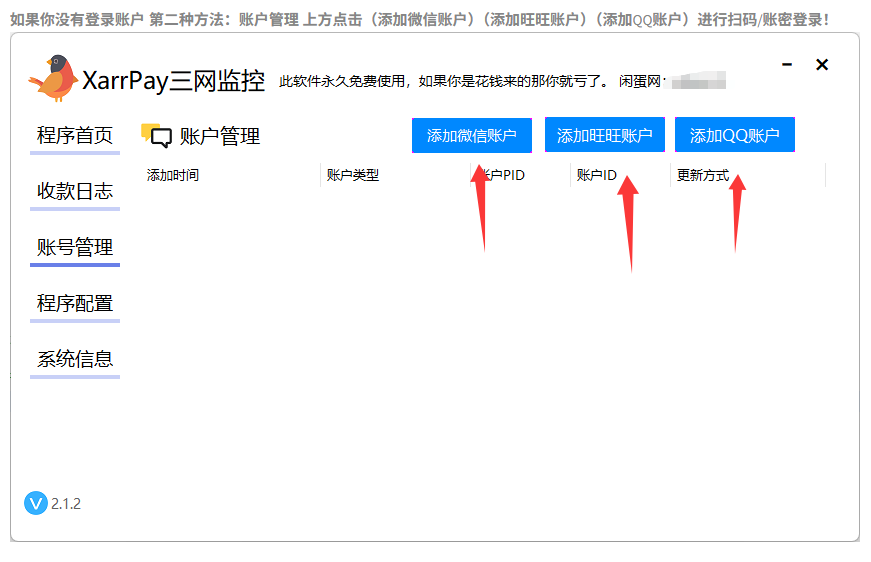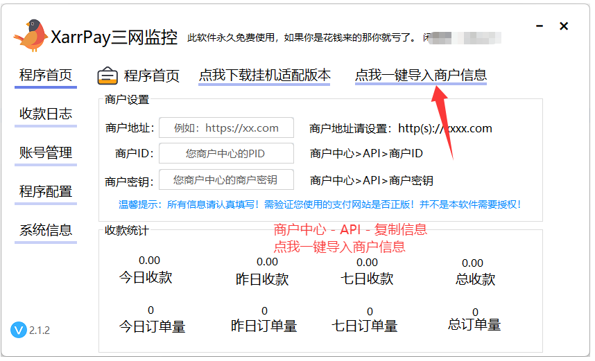 4.来到XarrPay三网监控软件界面(程序首页 - 点我一键导入商户信息)