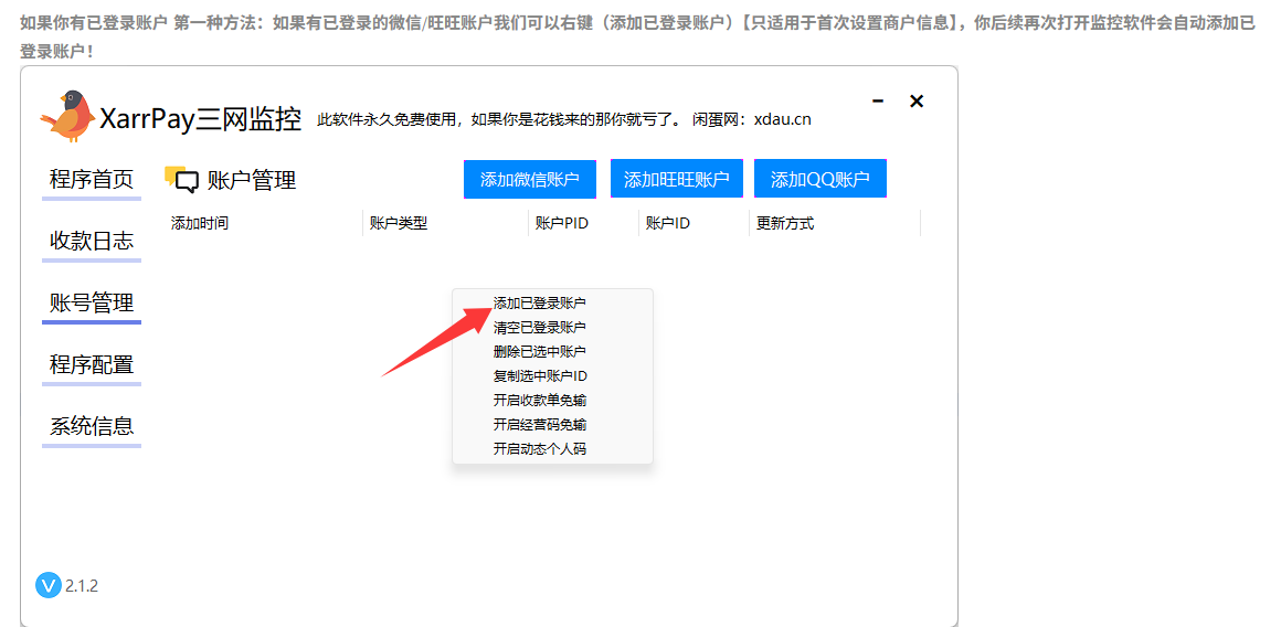 5.添加微信/支付宝/QQ账户(账号管理 未设置商户信息不会自动添加账户哦)